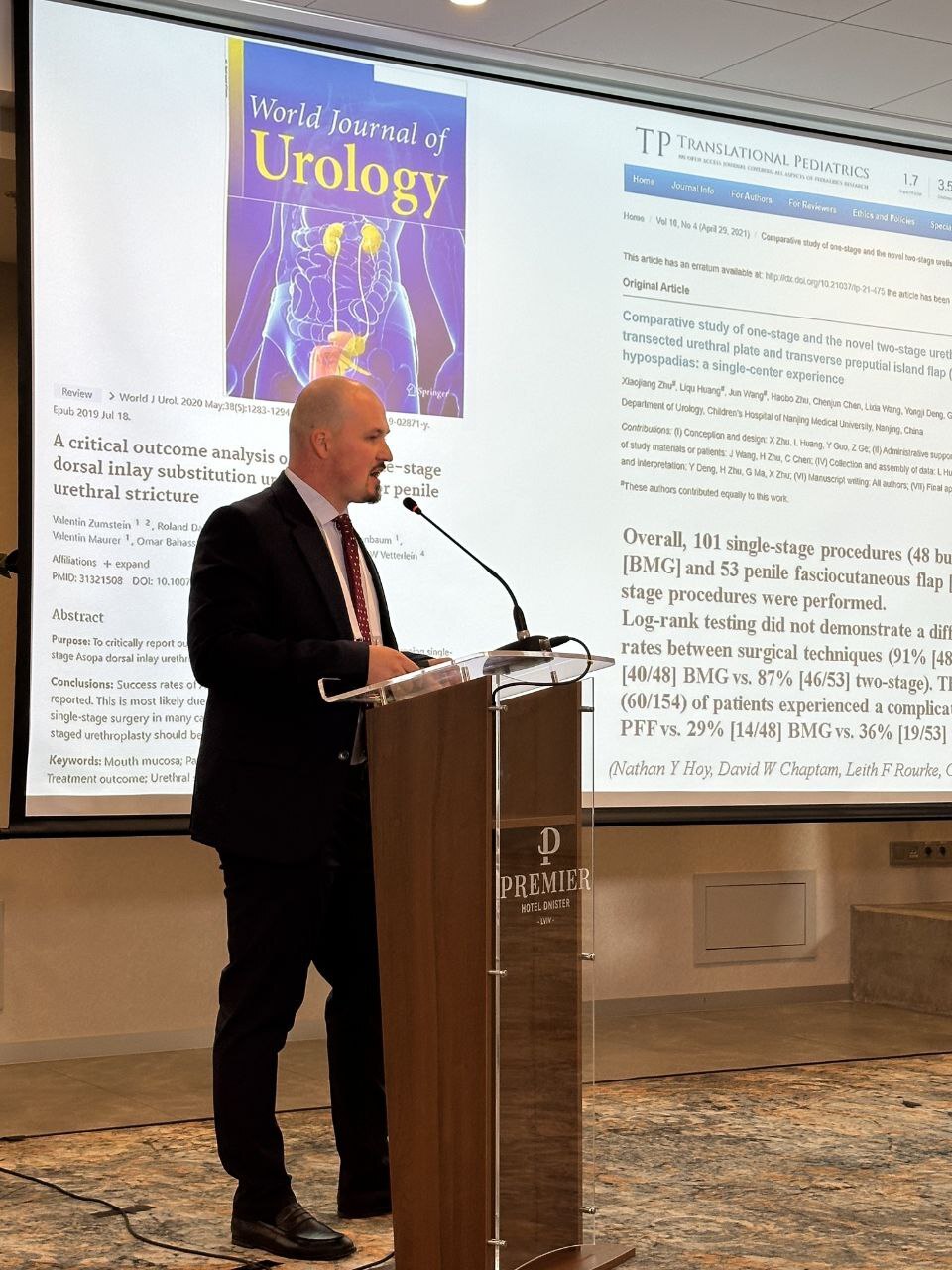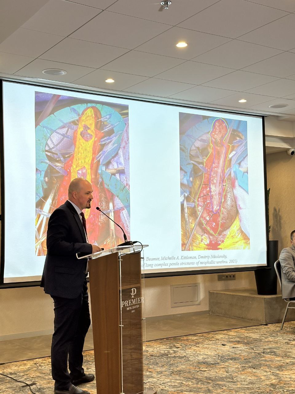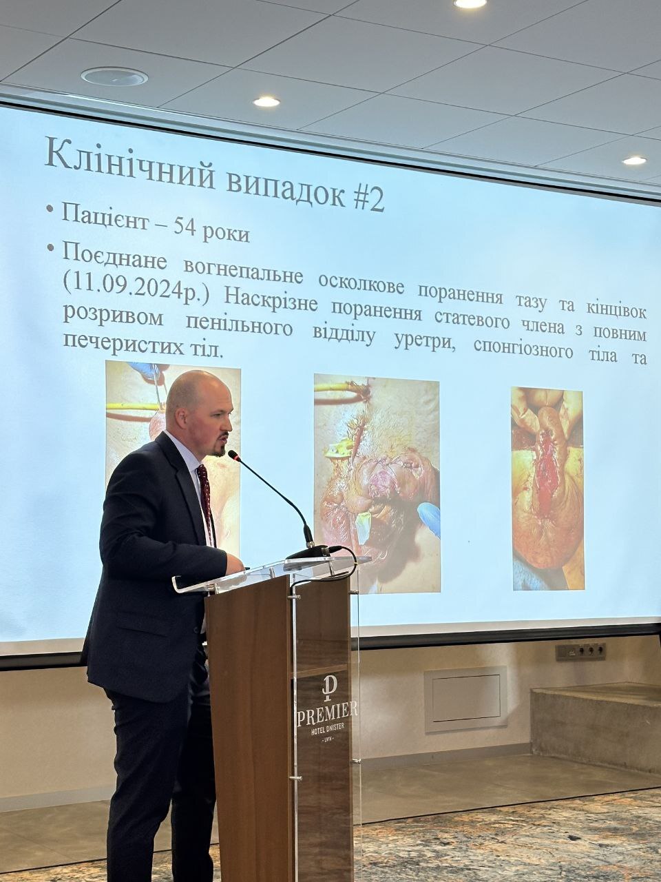 Серед спікерів лікар-уролог Бондарчук Володимир, який із вересня 2025 року розпочав прийом в Клініці МЕДІКОМ. Тема доповіді: "Роль етапної пластики при вогнепальних пораненнях пєнільного відділу уретри".