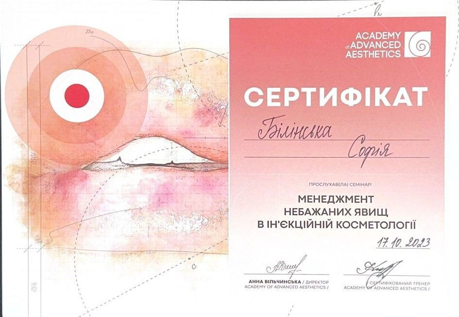 - 2023 г. — курс «Менеджмент нежелательных явлений в инъекционной косметологии».