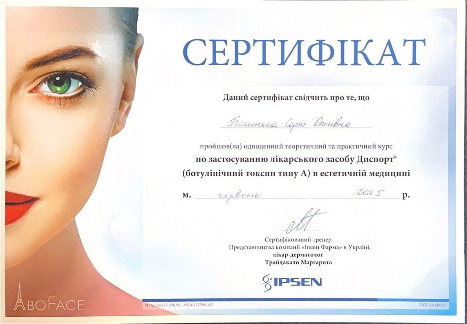 - 2025 г. — «Применение лекарственного средства «Диспорт» (ботулинический токсин типа А) в эстетической медицине».