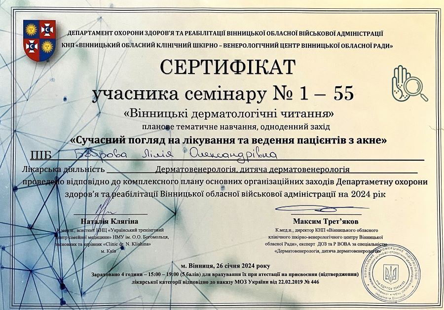 - 2024 г. – Тематическое обучение «Современный взгляд на лечение и ведение пациентов с акне».