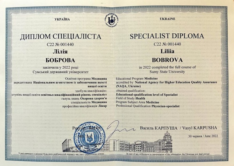 - 2016-2022 гг. – Сумской государственный университет, Медицина.