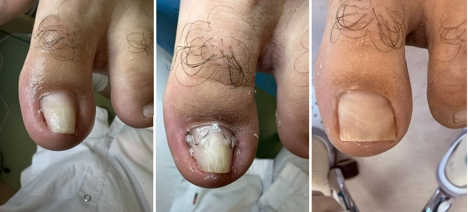 Подолог Клиники МЕДИКОМ Екатерина Покидько приняла решение установить W-скобу для постепенного выравнивания ногтевой пластины.